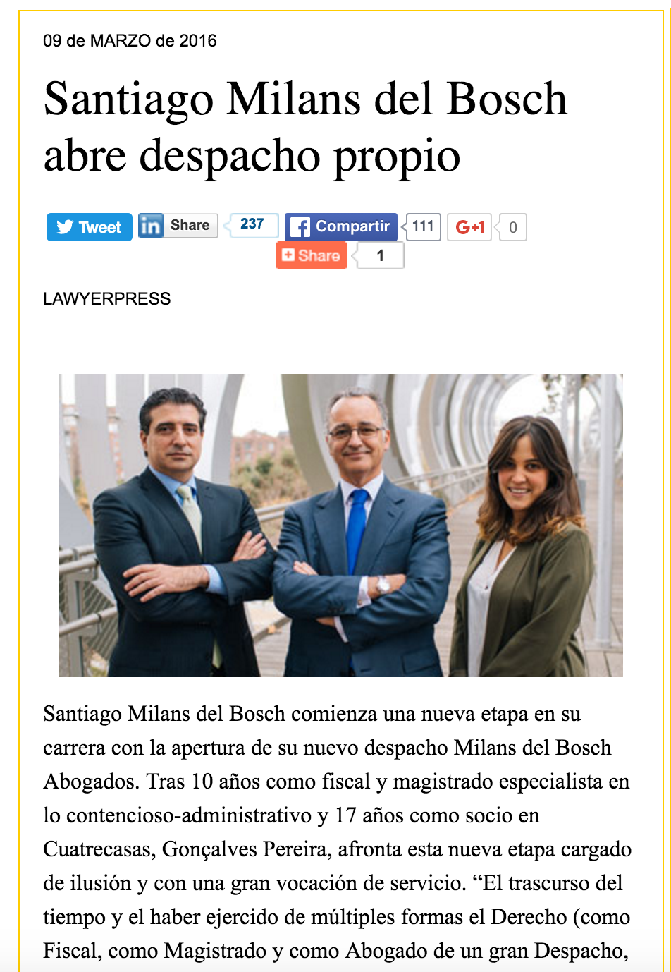Artículo sobre la apertura del despacho Milans del Bosch Abogados en Lawyer Press