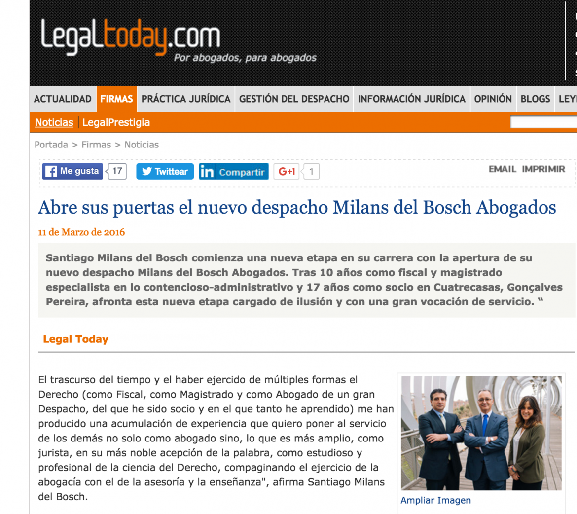 Artículo sobre la apertura del despacho Milans del Bosch Abogados en Legal Today