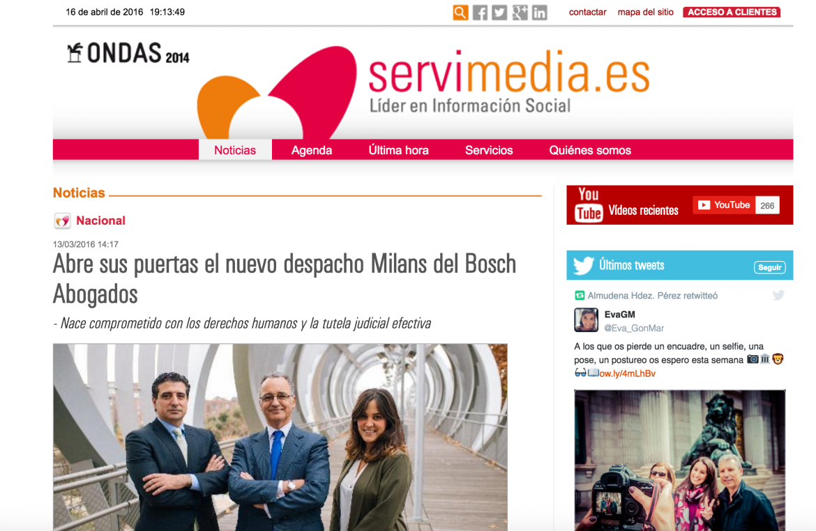 Artículo sobre la apertura del despacho Milans del Bosch Abogados en la agencia Servimedia.