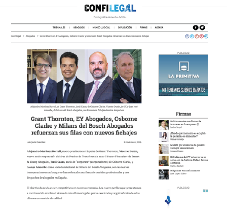 Artículo en ConfiLegal: “Grant Thornton, EY Abogados, Osborne Clarke y Milans del Bosch Abogados refuerzan sus filas con nuevos fichajes”