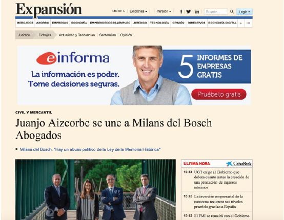 Artículo en Expansión: “Juanjo Aizcorbe se une a Milans del Bosch Abogados”
