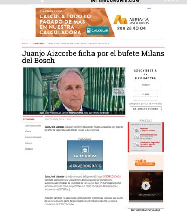 Artículo en Intereconomía: “Juanjo Aizcorbe ficha por el bufete Milans del Bosch”