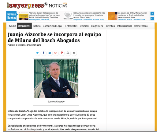 Artículo en Lawyer Press: “Juanjo Aizcorbe se incorpora al equipo de Milans del Bosch Abogados”