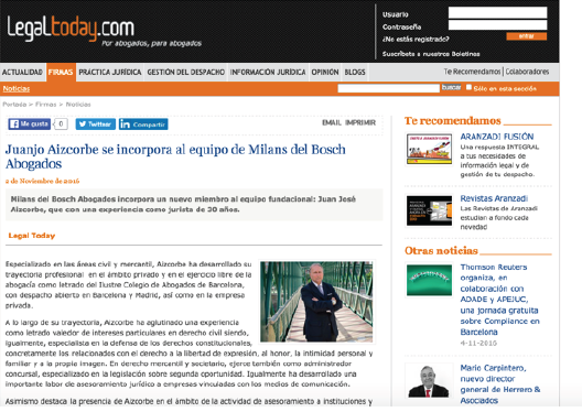 Artículo en Legal Today: “Juanjo Aizcorbe se incorpora al equipo de Milans del Bosch Abogados”
