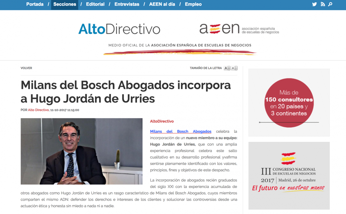 Artículo en AltoDirectivo, el medio oficial de la Asociación Española de Escuelas de Negocios: «Milans del Bosch Abogados incorpora a Hugo Jordán de Urries»