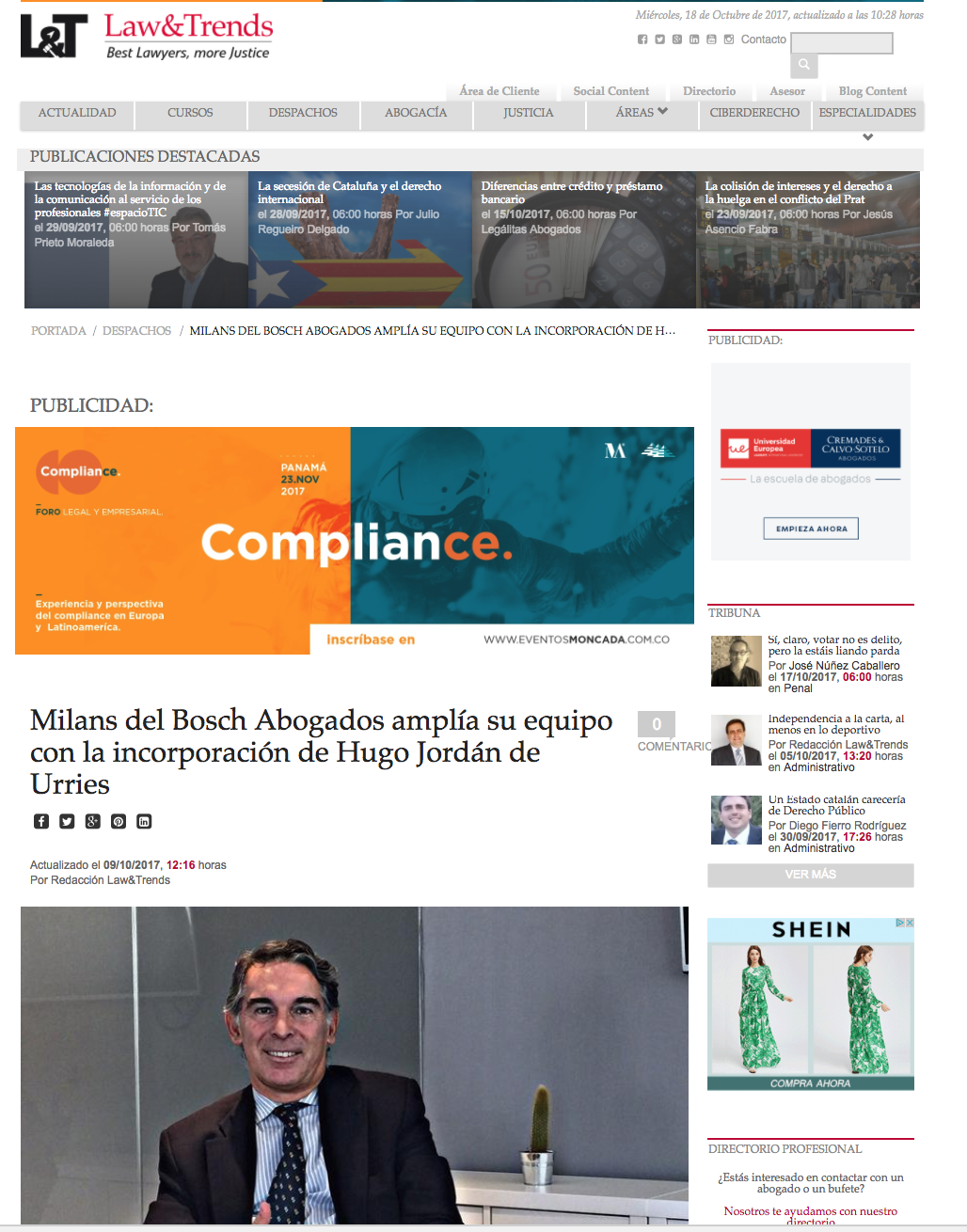 Artículo en Law & Trends: «Milans del Bosch Abogados amplía su equipo con la incorporación de Hugo Jordán de Urries»