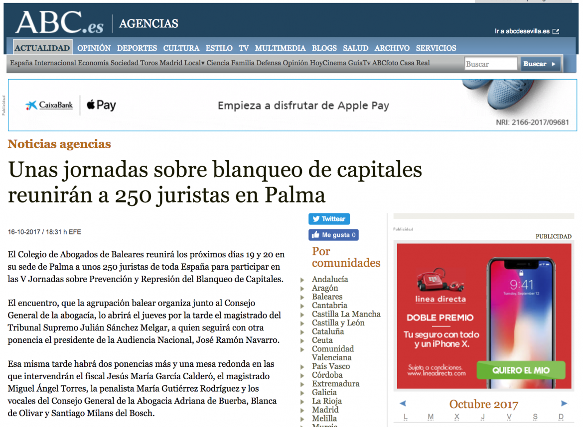 Artículo en el diario ABC: “Unas jornadas sobre blanqueo de capitales reunirán a 250 juristas en Palma”