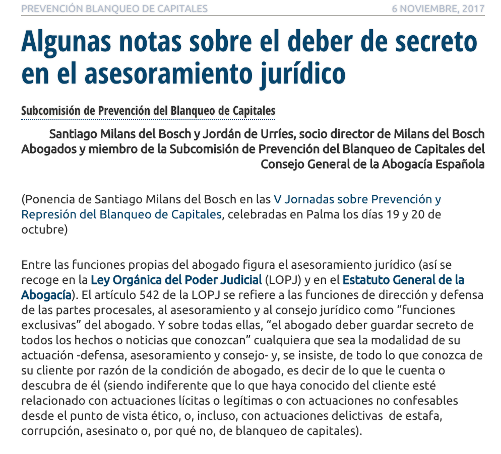 Entre las funciones propias del abogado figura el asesoramiento jurídico (así se recoge en la Ley Orgánica del Poder Judicial (LOPJ) y en el Estatuto General de la Abogacía). El artículo 542 de la LOPJ se refiere a las funciones de dirección y defensa de las partes procesales, al asesoramiento y al consejo jurídico como “funciones exclusivas” del abogado. Y sobre todas ellas, “el abogado deber guardar secreto de todos los hechos o noticias que conozcan” cualquiera que sea la modalidad de su actuación -defensa, asesoramiento y consejo- y, se insiste, de todo lo que conozca de su cliente por razón de la condición de abogado, es decir de lo que le cuenta o descubra de él (siendo indiferente que lo que haya conocido del cliente esté relacionado con actuaciones lícitas o legítimas o con actuaciones no confesables desde el punto de vista ético, o, incluso, con actuaciones delictivas de estafa, corrupción, asesinato o, por qué no, de blanqueo de capitales).