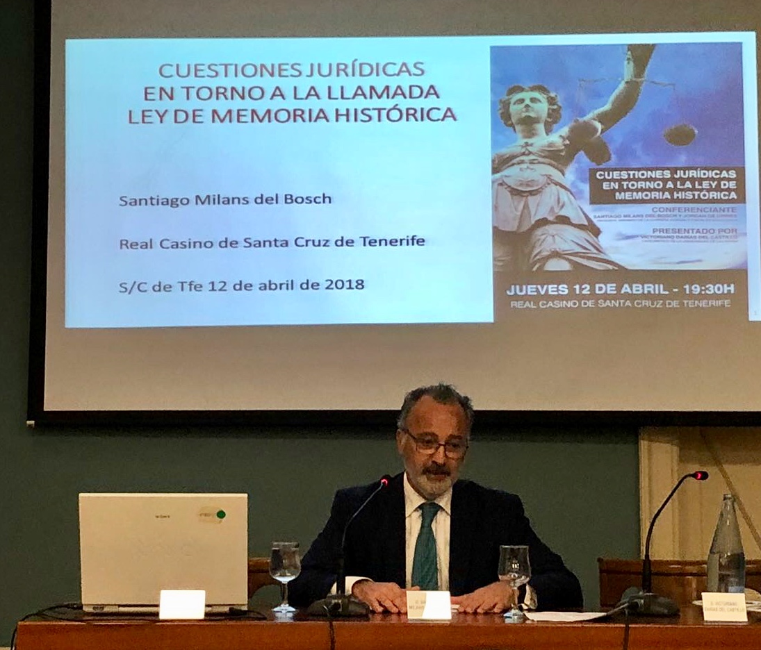 El pasado viernes 12 abril intervino Santiago Milans del Bosch, fundador y director del despacho Milans del Bosch Abogados, en una exposición en el Real Casino de Santa Cruz de Tenerife sobre cuestiones jurídicas en torno a la Ley 52/2007, de 26 diciembre, conocida como ley de memoria histórica.