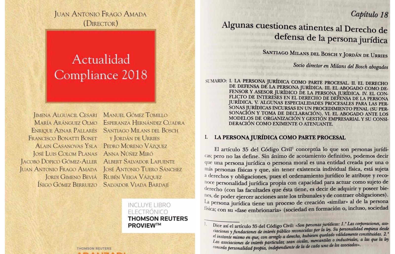 Santiago Milans del Bosch, socio director de MILANS DEL BOSCH ABOGADOS, ha colaborado en la obra colectiva “Actualidad Compliance 2018”, dirigida por el Fiscal don Juan Antonio Frago Amada y editada por Thomson Reuters Aranzadi. En dicha publicación, que ha salido a la luz este otoño, han intervenido insignes juristas.