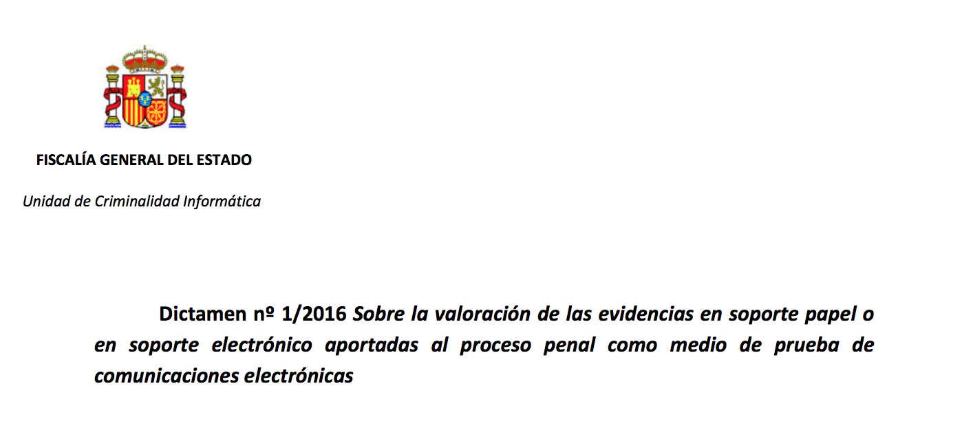 Por su interés, adjuntamos el Dictamen de la Fiscalía contra la Criminalidad Informática nº 1/2016 , de 30 de mayo de 2016, sobre la valoración de las evidencias en soporte papel o en soporte electrónico aportadas al proceso penal como medio de prueba de comunicaciones electrónica.