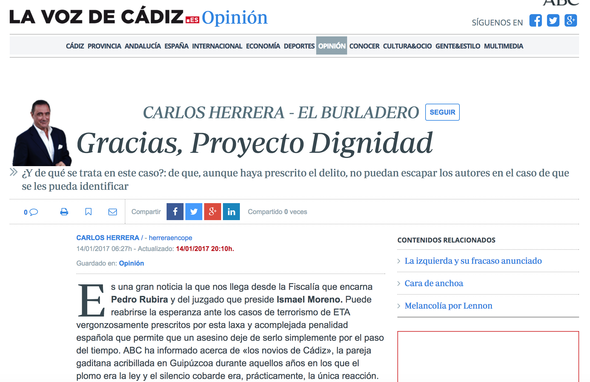 Artículo en La Voz de Cádiz: “Gracias, Proyecto Dignidad. Carlos Herrera-El Burladero”