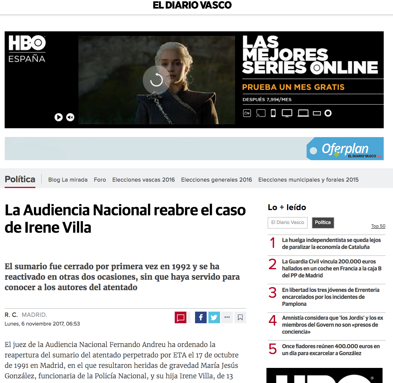 Artículo en El Diario Vasco: “La Audiencia Nacional reabre el caso de Irene Villa”