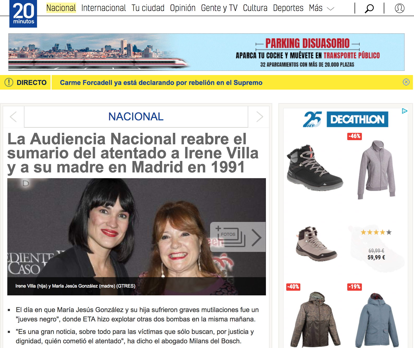 Artículo en 20 Minutos: “La Audiencia Nacional reabre el sumario del atentado a Irene Villa y a su madre en Madrid en 1991″