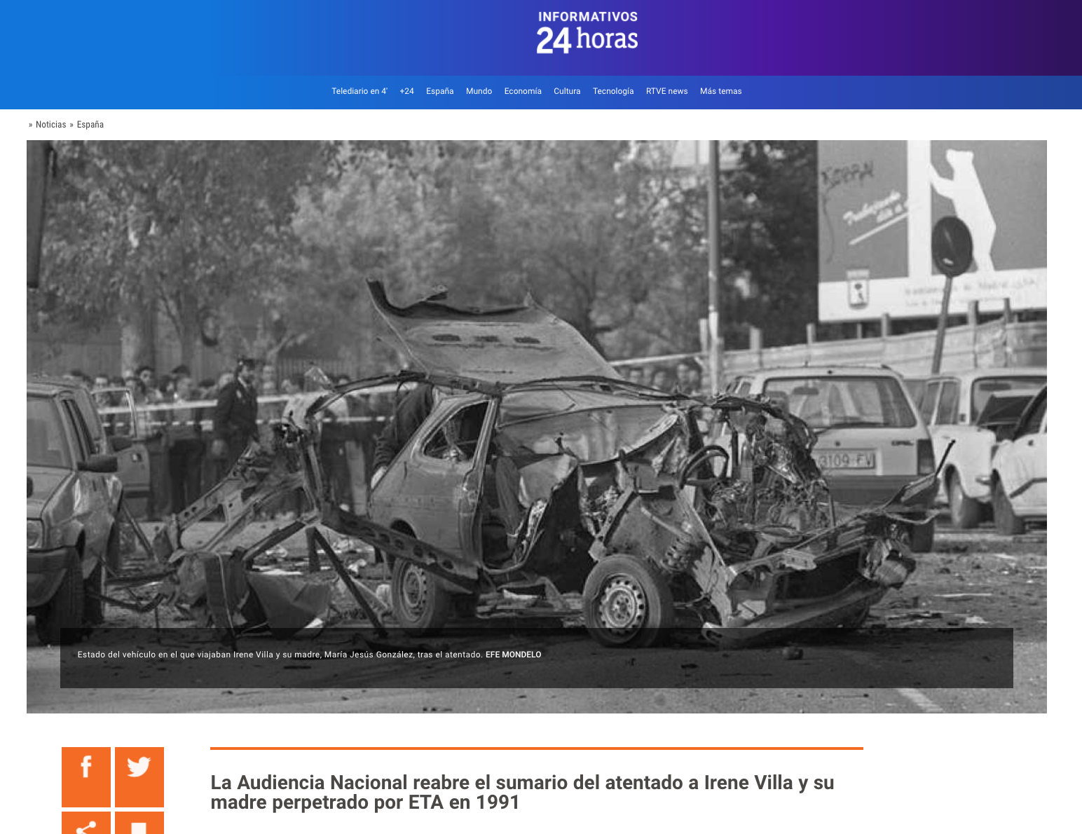 Artículo en RTVE: “La Audiencia Nacional reabre el sumario del atentado a Irene Villa y su madre perpetrado por ETA en 1991”