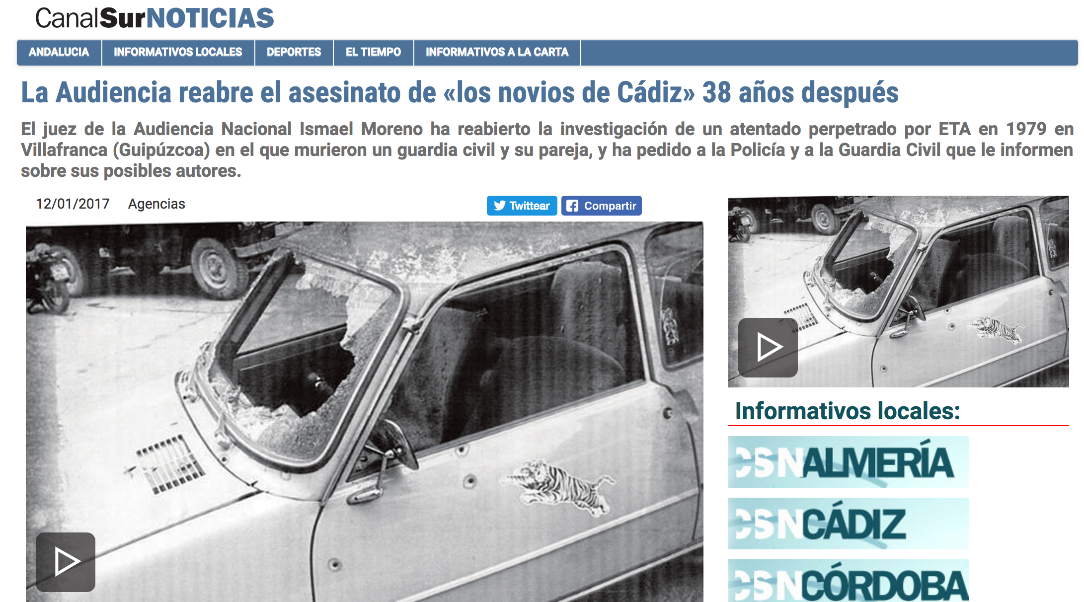Artículo en Canal Sur: “La Audiencia reabre el asesinato de «los novios de Cádiz» 38 años después”