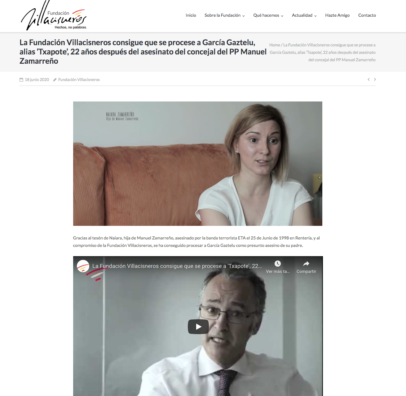 Gracias al tesón de Naiara, hija de Manuel Zamarreño, asesinado por la banda terrorista ETA el 25 de Junio de 1998 en Rentería, y al compromiso de la Fundación Villacisneros, se ha conseguido procesar a García Gaztelu como presunto asesino de su padre.
