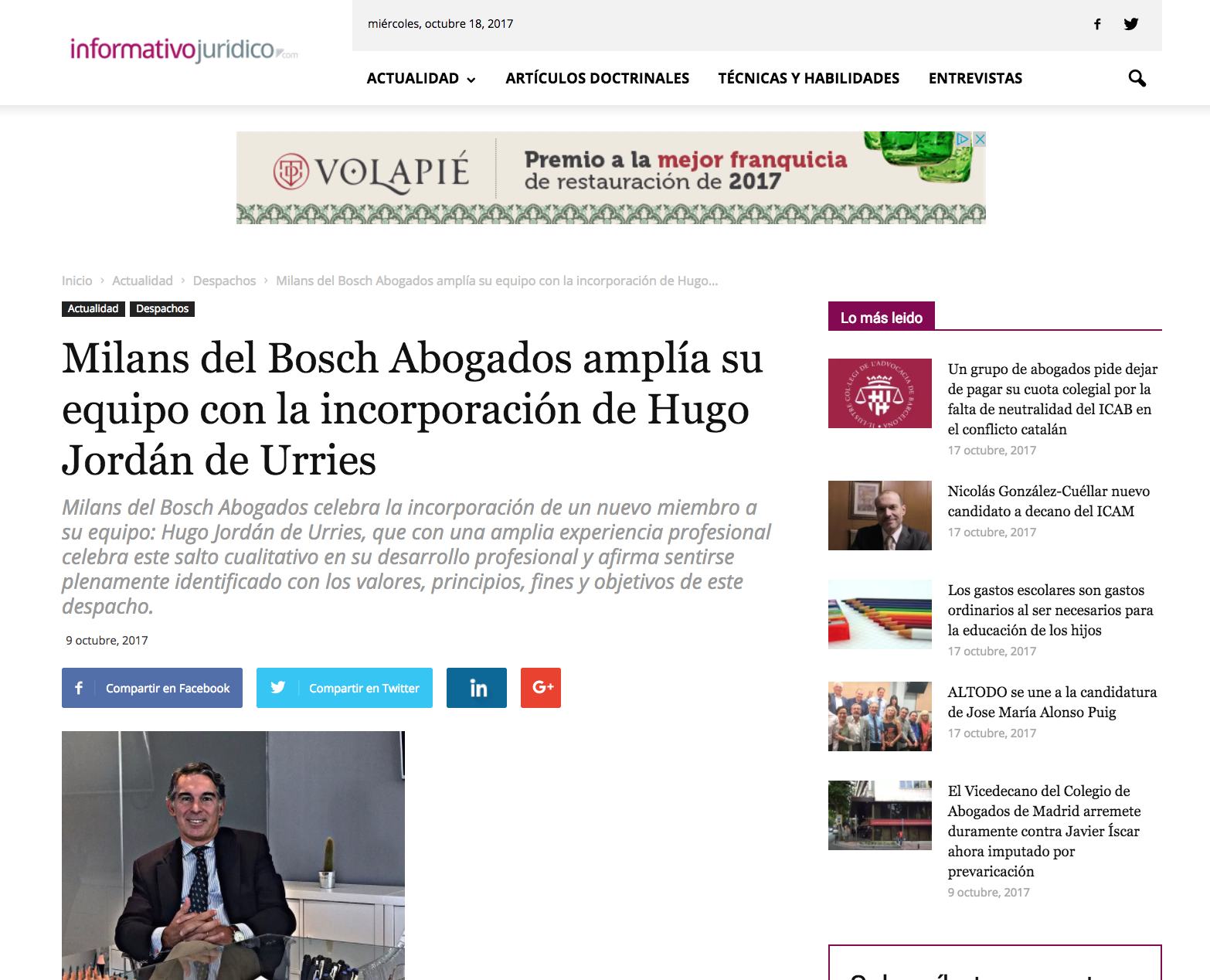 Artículo en Informativo Jurídico: «Milans del Bosch Abogados amplía su equipo con la incorporación de Hugo Jordán de Urries»