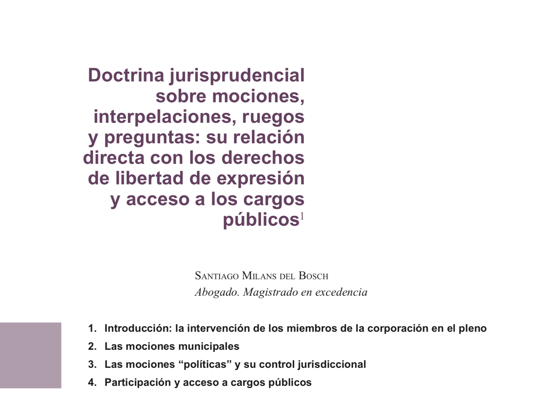 Nueva publicación de Santiago Milans del Bosch, director de MILANS DEL BOSCH ABOGADOS, en el nº 51 de los CUADERNOS DE DERECHO LOCAL, editados por la Fundación Democracia y Gobierno Local con el título “Doctrina jurisprudencial sobre mociones, interpelaciones, ruegos y preguntas: su relación directa con los derechos de libertad de expresión y acceso a los cargos públicos”.