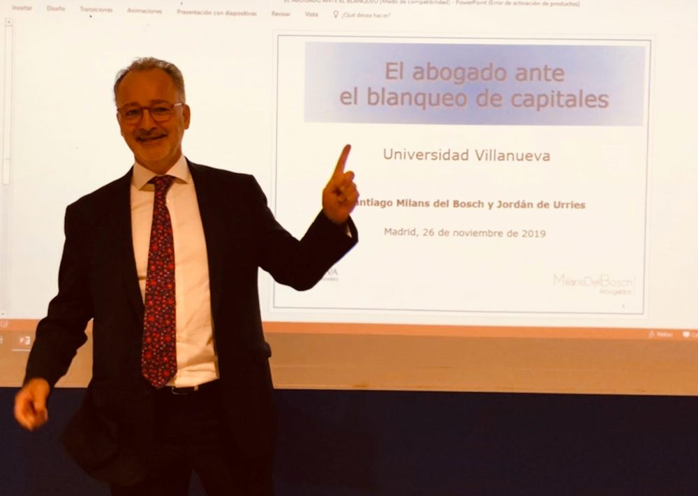 Esta mañana Santiago Milans del Bosch, el socio director de este despacho, ha impartido un seminario en el Centro Universitario Villanueva sobre “Los abogados ante el blanqueo de capitales” y sus deberes cuando participen en la concepción, realización o asesoramiento de operaciones por cuenta de clientes relativas a la compraventa de bienes inmuebles o entidades comerciales, la gestión de fondos, valores u otros activos, la apertura o gestión de cuentas corrientes, cuentas de ahorros o cuentas de valores, la organización de las aportaciones necesarias para la creación, el funcionamiento o la gestión de empresas o la creación, el funcionamiento o la gestión de fideicomisos («trusts»), sociedades o estructuras análogas, o cuando actúen por cuenta de clientes en cualquier operación financiera o inmobiliaria, tal y como recoge el art. 2 ñ) de la ley de prevención del blanqueo de capitales.