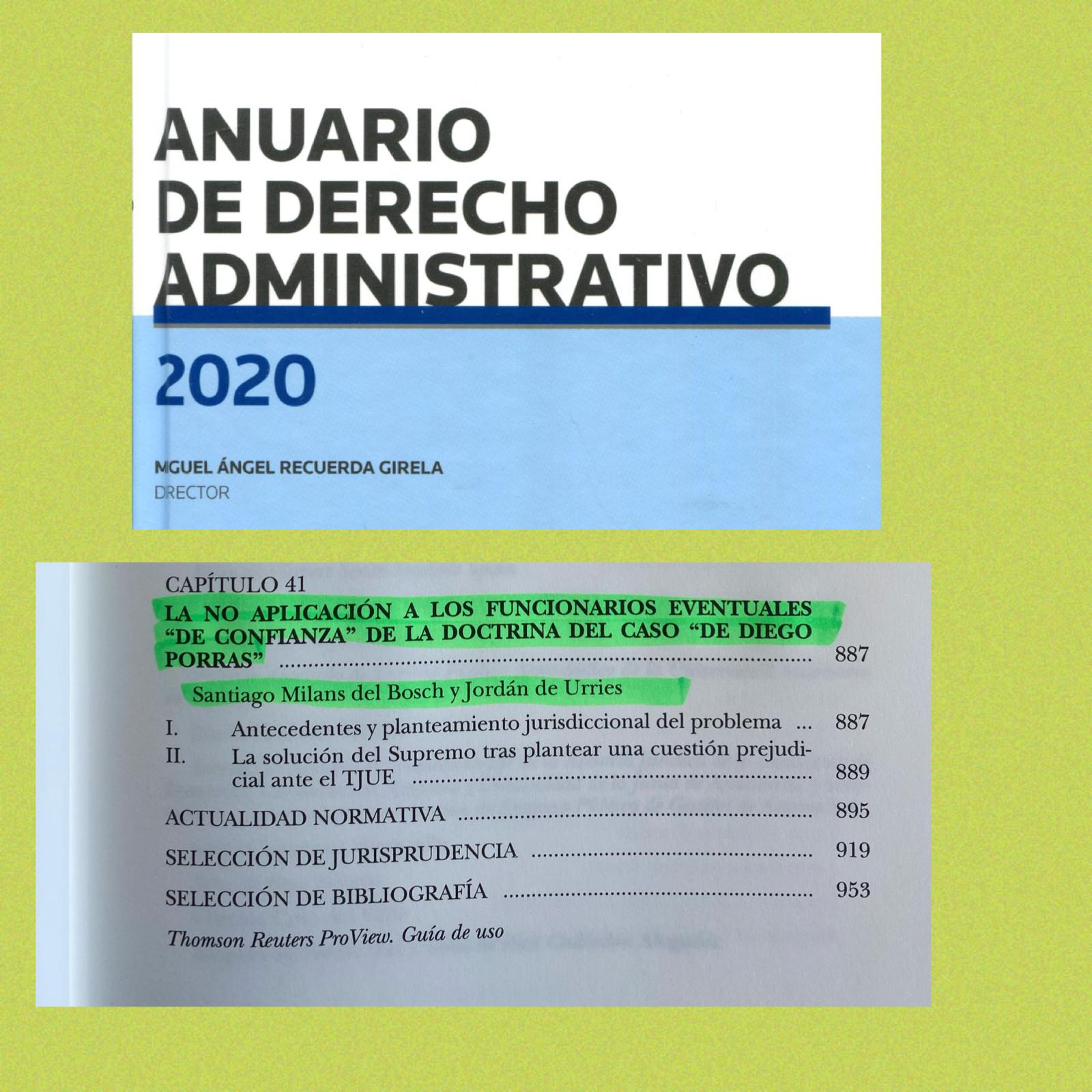 Acaba de editarse en Anuario de Derecho Administrativo 2020, obra de referencia entre los administrativistas españoles, dirigida por el catedrático Miguel Angel Recuerda Girela, en la que ha participado nuestro socio director, Santiago Milans del Bosch, junto a destacados juristas, con el capítulo “La no aplicación a los funcionarios eventuales ‘de confianza’ de la doctrina del caso De Diego Porras”.