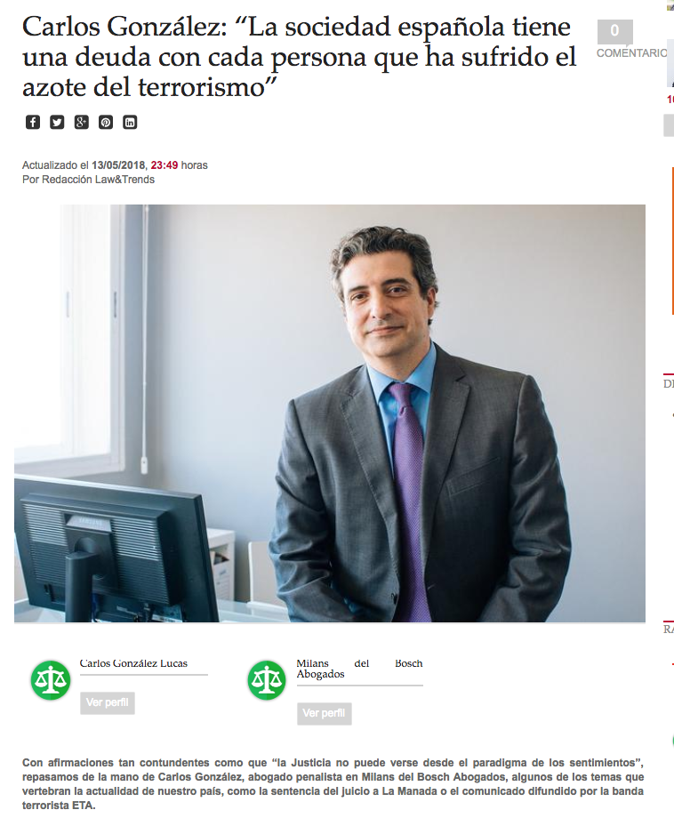 Con afirmaciones tan contundentes como que “la Justicia no puede verse desde el paradigma de los sentimientos”, repasamos de la mano de Carlos González, abogado penalista en Milans del Bosch Abogados, su pertenencia a este despacho y algunos de los temas que vertebran la actualidad de nuestro país, como la sentencia del juicio a La Manada o el comunicado difundido por la banda terrorista ETA.